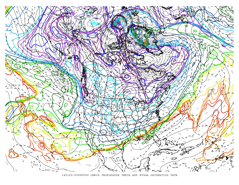 Pictured: The colored lines show potential temperature at the tropopause, while the dashed black lines show the saturation potential temperature near the surface. The solid black lines are surface pressure. (Courtesy of PAOC Synoptic Lab Tropopause Maps: http://wind.mit.edu/~reanal/pv.html)